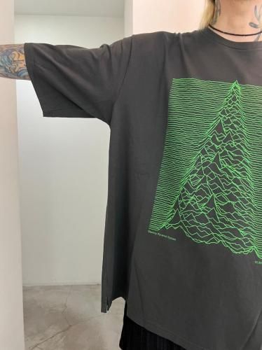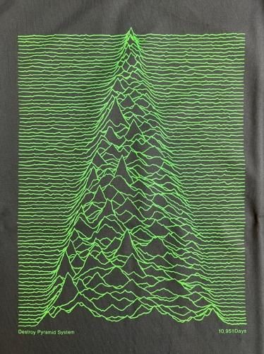 過去のグラフィックをリバイバルしたデザインでピラミッド型に浮かび上がる波形図柄をプリントしています。