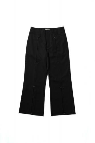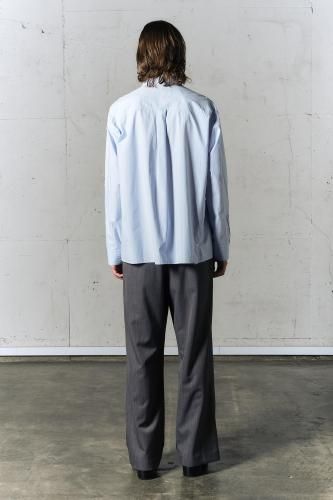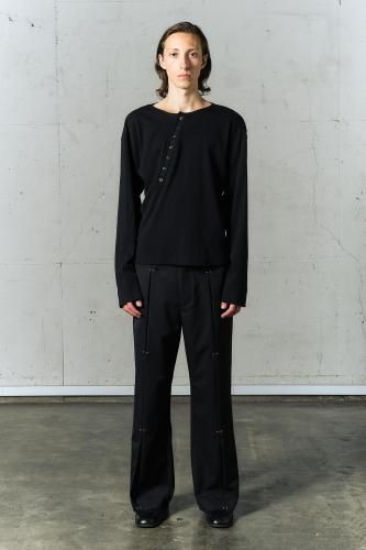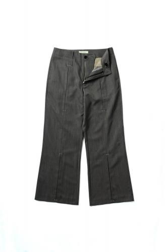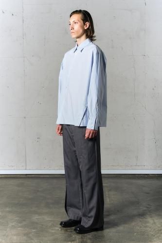 強撚TWギャバジン素材を使用したトラウザーズ。フロントにあしらったスタッズがアクセントとなり、さりげない主張を添えています。さらにインバーテッドプリーツを施すことで、身体の動きに合わせて開閉し、シンプルな中にも動きのあるデザイン性を演出。また、ベルトループを2箇所に配置することで、ウエスト位置を好みに合わせて調整可能です。"STUDDED MOTION PLEAT GAB JACKET"とセットアップでご着用いただけます。