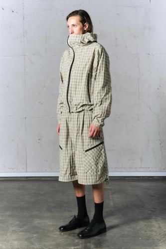 ハリのあるリップストップナイロン素材を使用したフードジャケット。立体裁断により、身体の動きに沿った構築的なパターンが特徴です。全体にベンチレーションアイレット装飾を施し、さりげないアクセントをプラス。アウトドアのディテールを取り入れながらも、カジュアルスタイルはもちろん、きれいめなトラウザーとも好相性の一着に仕上げました。ウエストとフードはスピンドルで調節可能です。