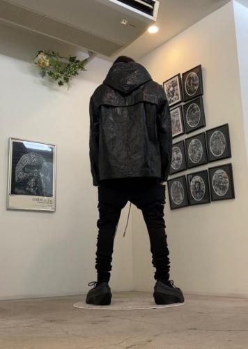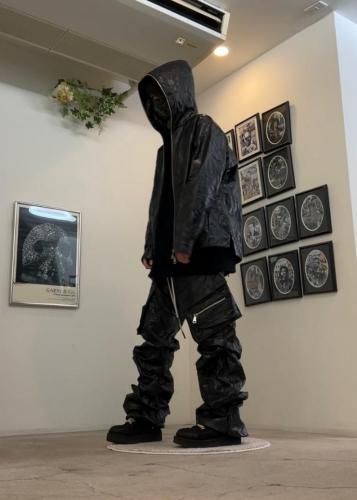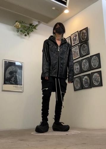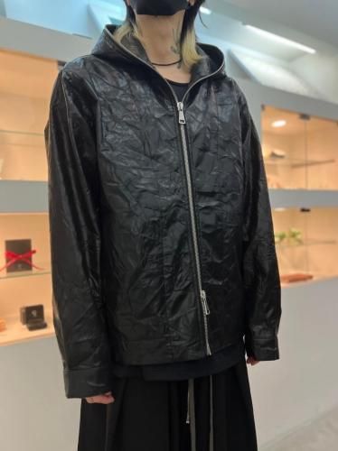 【STAFFコメント】薄手のシンセティックレザーにシワ加工を施したジップブルゾン。シンプルなデザインですがフロントジップはフード口までぐるりと一周配置し、生地に主張があるアイテム。