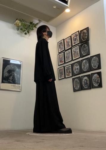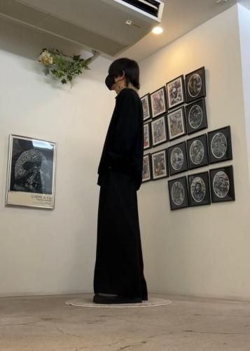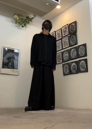 【STAFFコメント】フロント左右のダブルラップ仕様によりインバーテッドプリーツような奥行きを持たせたワイドスラックス。タテ糸にスーパー130s糸、ヨコ糸にレギュラー糸を使用し、仕立て映えするように仕上げたウールギャバ素材。ナノレベルの染色でより深い黒を表現し、高い撥水性と防汚性を備えています。