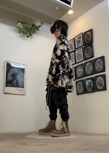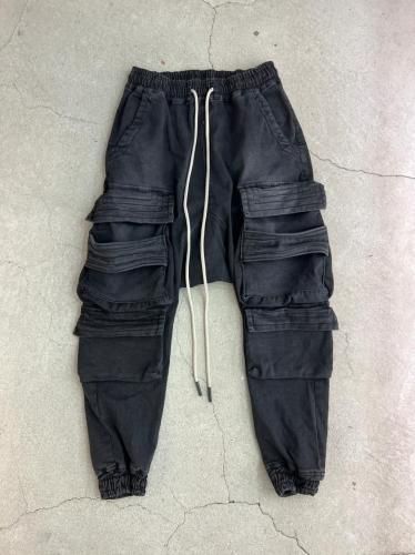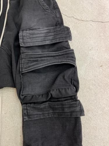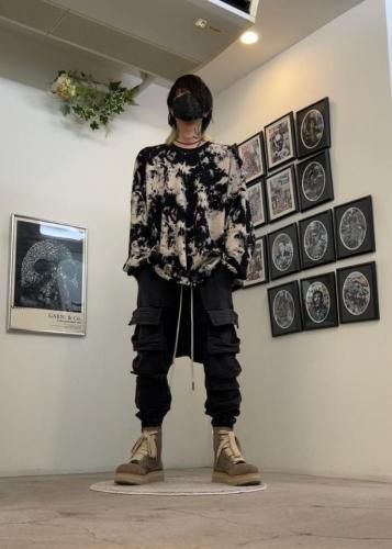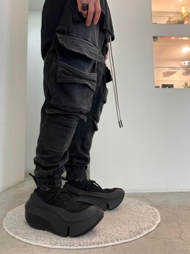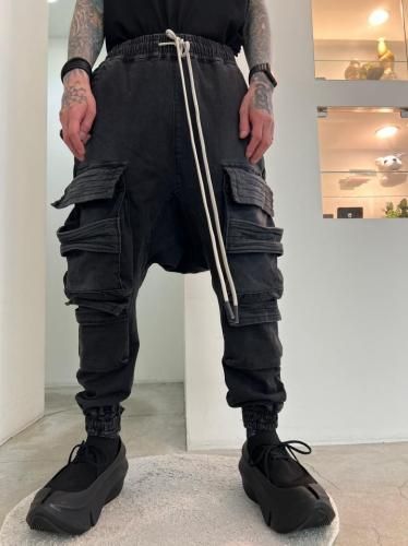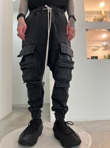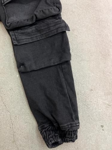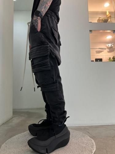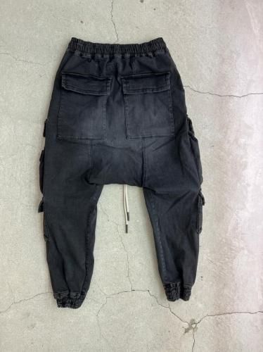 【STAFFコメント】定番シルエットのDenim Sarouel Pantsをブラッシュアップしたジョガーパンツ。かなり深めに取った股上で裾はリブ仕様。カーゴポケットを合計4つ配置し、ベルトで装飾。ウエストはイージー仕様で長いドローコードが付属。非常に伸縮性の高いストレッチデニムを使用し、ゆとりのあるサルエルシルエット。全体にエイジング加工を施しています。