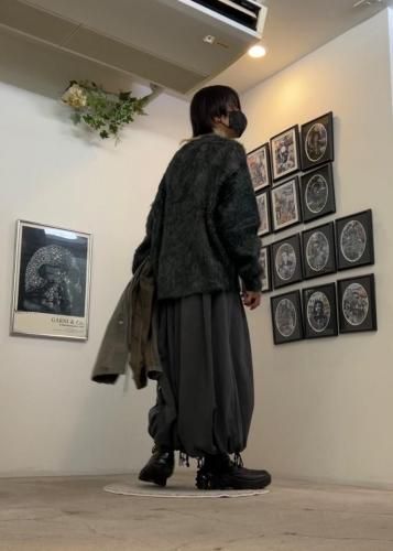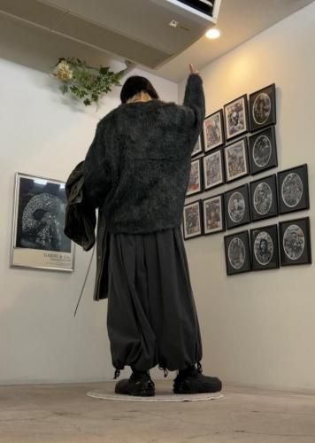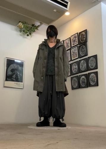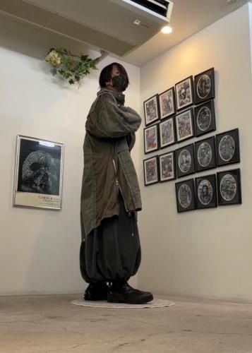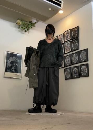 ・コットンツイルとナイロンリップストップのドッキングモッズコートのインナーはかすり糸のシャギーVネックプルオーバー。ボトムスはナイロンに顔料コーティングを施した袴バルーンパンツ。足元は履き込む毎に無骨なドレープが生み出されるサイドジップブーツ。
