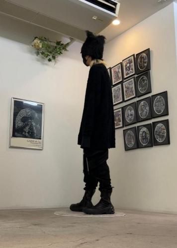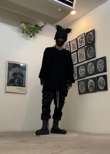 ・退廃的なダメージパイル素材のドルマンスリーブに樹脂コーティングを施し、ベルトを装飾したサルエルジョガーデニムでシンプルに。悪魔をイメージした耳付きニットキャップをアクセントに、足元はヴィブラムのアレキサンダーソールを使用したサイドジップブーツでブーツイン。