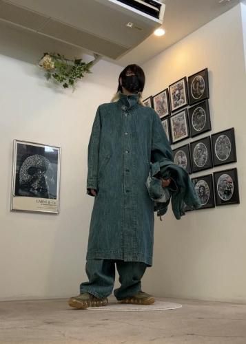 ・コートはVOAAOVの織目を強調したランダムクランチ織の13ozデニムロングコート。フロントはボタンでの開閉、バックはボタンでセンターベンツの深さを調整可能。襟のボタンでハイネックでも着用可能。厚手の13ozでランダムクランチ織で存在感ある素材感。