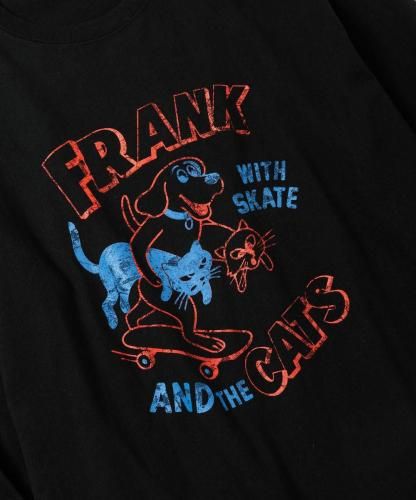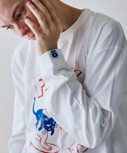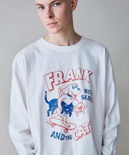 フロントにレトロなタッチで犬と猫がスケートボードで遊んでいるグラフィックを描いた遊び心あふれるロングスリーブカットソーです。