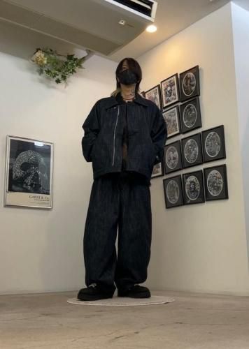 ・ボトムスはVOAAOVの織目を強調したランダムクランチ織の13ozデニムワイドパンツ。まるみを強調したコクーンシルエットに仕上がっています。厚手の13ozでランダムクランチ織で存在感ある素材感。