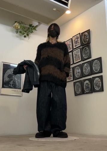 ・トップスはLAD MUSICIANのニードル起毛加工によるファーの様な長い毛足が特徴のループヤーンシャギーニットを使用したプルオーバーニット。パーツごとにボーダーの大きさを変え、両サイドにポケットを配置。ワンサイズ展開でゆとりのあるフリーサイズ。