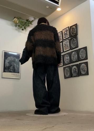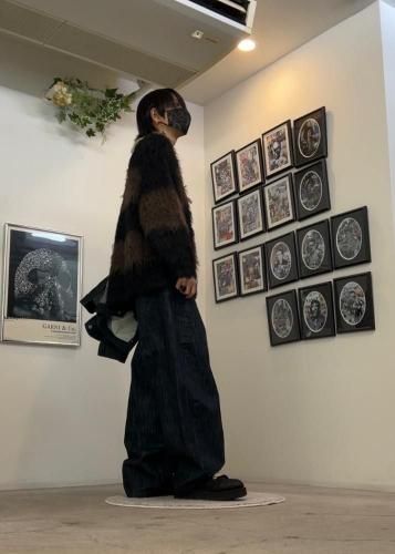 ・ランダムクランチ織でザラつきある表情の13ozデニムのブルゾンとジーンズでセットアップ。ショート丈のブルゾンとコクーンシルエットのジーンズでスッキリした印象に。トップスはニードル起毛加工によるファーの様な長い毛足が特徴のループヤーンシャギーニットで秋冬仕様。足元は極太シューレースのヌバックレースアップブーツで重量感をプラス。