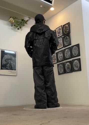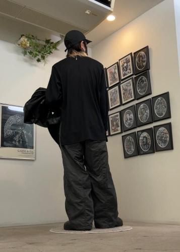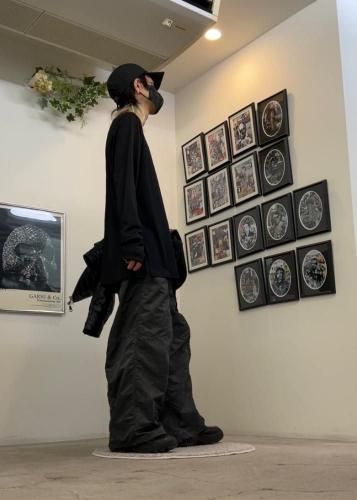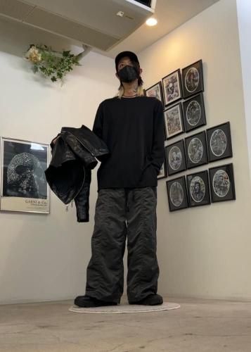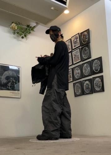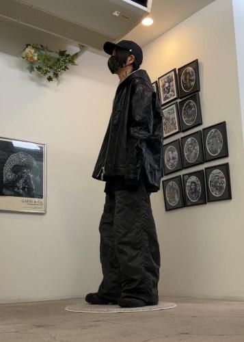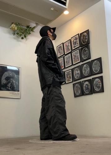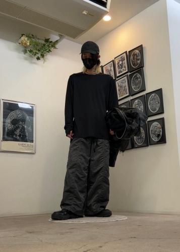 ・ボトムスはprasthanaの高密度に織り上げたナイロン100%のツイル素材ニータックバギーパンツ。高密度のナイロンツイルに、顔料コーティングを施した後、原反ワッシャーを行うことによってエイジング感を出しています。立体的なパターンで作成しており、裾に向けて迫力のあるラインを描きながら、メリハリのあるシルエットメイクを実現。裏地にはアセテート素材を使用し滑らかな穿き心地。