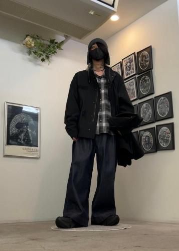 ・ドロップショルダーオーバサイズのオンブレチャックシャツにベストとレイヤード可能なM-65を羽織で。ボトムスは12ozリジッドデニムで包み込むタックが特徴のワイドデニム。耳当て付きのニットキャップをアクセントに、足元はオルカでインパクトをプラス。