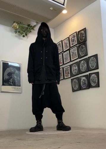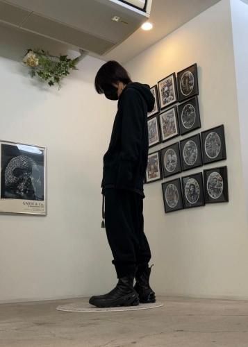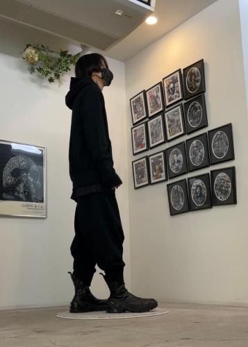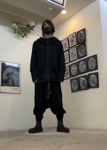 ・ヘビーウェイト裏毛スウェットのハイネック立体フーディーとサルエルイージーパンツでセットアップ。トップスはキックバックの強いリブ素材のサイドスリットロングカットソー。足元はで履き込む毎に無骨なドレープが生み出されるサイドジップブーツ。