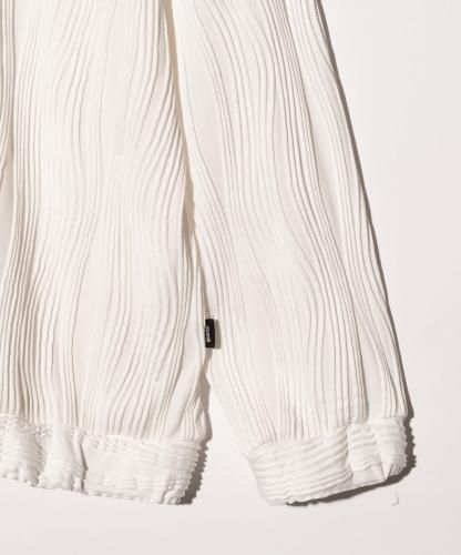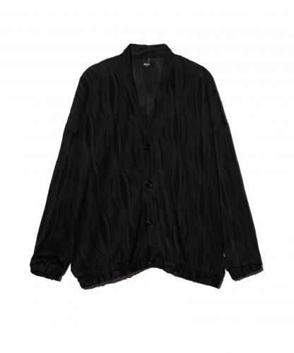 glambの人気カットソー“Willow Crepe”をカーディガンスタイルで提案するWillow Crepe Cardigan。素材に用いたのは凹凸のある流線形のタックが刻まれた生地。編み針で網目を作り、さらに編み地に結び付けるという丹念な工程によって奥行のある畝を形作っています。コンパクトに設計されたシルエットはシャツやTシャツの上から羽織ってももたつかず、エッジィな印象。Willow Crepe Pantsとセットアップでの展開となりますが、単体でもシーズンレスに幅広いスタイリングへ対応します。