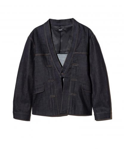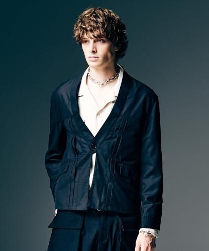 和装のエッセンスを取り入れたジャケットと、ブランドの新定番となっているボトムスを組み合わせたのがKimono Based Jacket Set Up。トップスはノーカラーのフロントデザインに着物にインスピレーションを得たディテールをミックス。一つボタンのボディは着丈をコンパクトにまとめたショートレングスに仕立てています。ボトムスはコレクションの度に好評を博すタック使いのバギーシルエットを用いたCrossover Tuck Pants。腰元に4タック、膝に2タック、裾にダーツを設けて構築したバルーンのボディはレングスを九分丈に設定し、足元にオフバランスな視覚効果を演出します。2色展開となる本作は、Blackに滑らかな落ち感のレーヨン混スーツ地、Indigoはクリーンなルックスのノンウォッシュデニムを使用。野心的なセットアップスタイルからそれぞれの単体使いまで、可能性に満ちた2アイテムをバリューあるセットプライスで提案します。