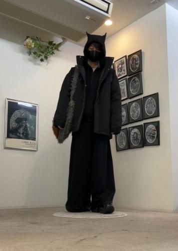 ・悪魔の角をイメージしたジップフーディーとワイドパンツは24ゲージ裏毛スウェットのセットアップ。フィルパワー650のダウンを使用し防寒性抜群のモンスターパーカーを羽織りで。ツイストシャギーのトートバッグをアクセントに、足元はスカイスクレーパーでインパクトをプラス。