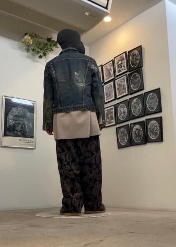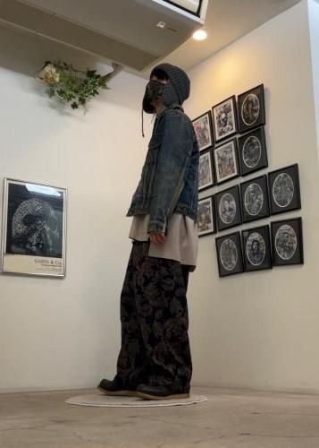 ・ボトムスはmy beautiful landletのベロアのような起毛感あるシェニールヤーンジャガードを使用したブランド定番シルエットのコクーンワイドイージーパンツ。インパクトのあるペイズリージャガード。