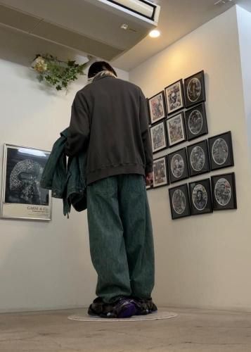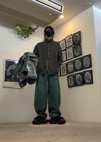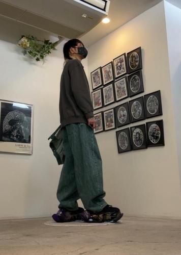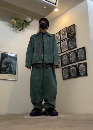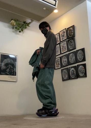 ・ランダムクランチ織の13ozデニムブルゾンとまるみを強調したコクーンシルエットのワイドパンツでセットアップ。トップスはダブルジップのスウェットブルゾンでシンプルに。足元はスカイスクレーパーでインパクトをプラス。