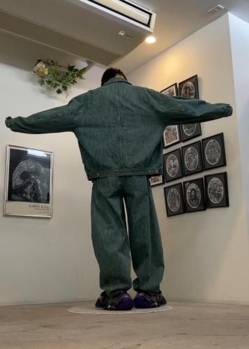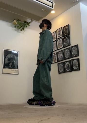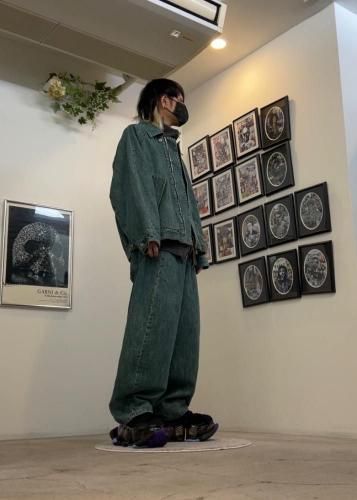 ・ボトムスはVOAAOVの織目を強調したランダムクランチ織の13ozデニムワイドパンツ。まるみを強調したコクーンシルエットに仕上がっています。厚手の13ozでランダムクランチ織で存在感ある素材感。