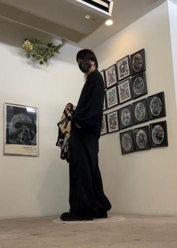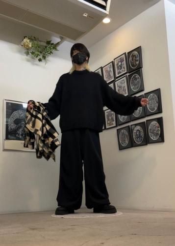 ・ボトムスはLAD MUSICIANのポリエステルサージ素材を使用したオーバーパンツ。シルエットは膝にタックを入れたボリュームあるオーバーパンツでウエストはゴムとドローコードのイージー仕様。裾はドローコードでシルエットの変化が可能。
